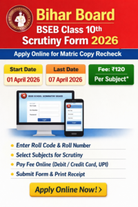 Bihar School Examination Board (BSEB) has started the Class 10th Scrutiny Online Form 2026 for students who want rechecking of their answer sheets after the Matric result. Candidates can apply online through the official website by using their Roll Number, Roll Code, and Password within the given dates.