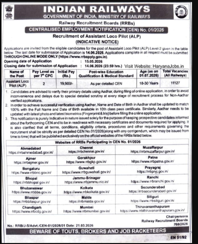 The Railway Recruitment Board (RRB) has released a short notification for the recruitment for Assistant Loco Pilot (ALP) posts on its official website under CEN No. 01/2026. This recruitment drive is being conducted for approximately 11,127 vacancies across various railway zones. The online application process will start from 15 May 2026 and the last date to apply is 14 June 2026. The minimum age limit for candidates is 18 years and the maximum age limit is 30 years as on 01 july 2026. Interested candidates are advised to check the complete details regarding Railway RRB ALP Recruitment 2026 before applying. The detailed notification and application link are provided below.